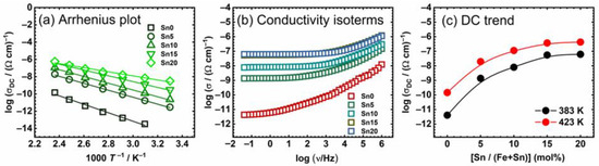 (a) Arrhenius plots of DC conductivity and (b) conductivity isotherms measured @383 K for individual samples from α-SnxFe1−xOOH NPs series; (c) compositional dependence of DC conductivity at various temperatures for individual α-SnxFe1−xOOH NPs. Lines in (a) are obtained through linear regression, while the lines connecting data points in (c) are drawn as guides for the eye.