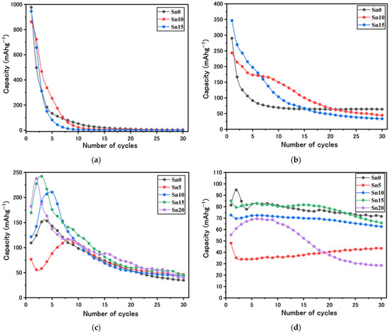 The initial discharge capacities of Sn0, Sn10, and Sn15 were 290, 243, and 347 mAh g−1 during the insertion, and the reversible capacity was 206, 212, and 287 mAh g−1, respectively. However, the discharge capacity of all samples decreased with an increasing number of cycles, dropping to 63.8, 43.7, and 35.9 mAh g−1.