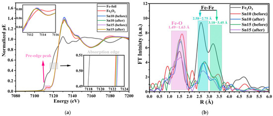 XANES and EXAFS spectra α-Fe2O3, γ-Fe2O3, and Fe3O4 measured at 250, 150, and 50 K are shown in Figure S2. For the Fe K-edge XANES spectra of α-Fe2O3 and γ-Fe2O3, a stable energy of 7109 eV was recorded at the μE value of 0.5 regardless of the temperature, as shown in Figure S2a. These results indicate that the XANES spectra did not detect the change in the oxidation state of the Fe ion. A slightly smaller energy of 7108 eV was observed at the μE value of 0.5 for the XANES spectra of Fe3O4, regardless of the measured temperature. The smaller energy of 7108 eV observed from the XANES spectra of Fe3O4 is due to the existence of Fe2+, while α-Fe2O3 and γ-Fe2O3 showed a larger energy of 7109 eV because they contain only Fe3+ [38,39]. As for the Fe K- edge FT-EXAFS spectra of α-Fe2O3, γ-Fe2O3, and Fe3O4, the first and second with radial distances of 1.4 Å due to Fe-O and 2.6 Å due to Fe-Fe do not change by changing the temperature, as shown in Figure S2b [38,39]. These two peaks are commonly found in α-Fe2O3, γ-Fe2O3, and Fe3O4. Therefore, it is difficult to determine the oxidation state of the Fe [38,39]. Overall, the relative intensities of each peak increased with the temperature decrease. The increased relative intensities of each peak in EXAFS spectra are due to the increased possibility of the energy transition of the targeting element of Fe by excluding thermal vibration. By comparing the structural information obtained by 57Fe-Mössbauer spectroscopy and Fe K-edge XAFS spectroscopy, precise structural information is available for 57Fe-Mössbauer spectroscopy.