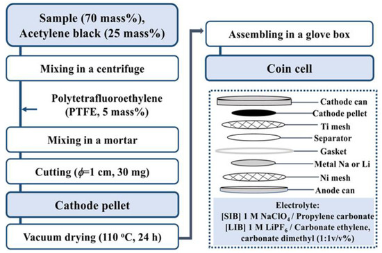The performances of the Na- and Li-ion batteries were monitored in the charge–discharge process, repeated up to 30 times using TOSCAT 3100SK (Toyo-System, Fukushima, Japan) under the setting voltage from 0.8 to 4.0 V with the current density of 5 and 50 mA g−1.