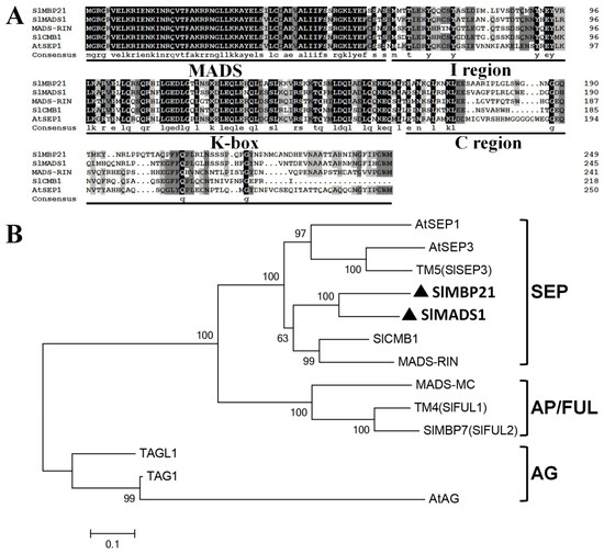 To study the roles of SEP MADS-box proteins played in tomato, we concentrated our work on the two SEP MADS-box genes, SlMBP21 and SlMADS1. Sequence analysis displayed that SlMBP21 harbors a 753 bp ORF encoding a protein with 250 acid residues and this protein has an estimated molecular mass of 28.44 kDa (pI 8.95). SlMADS1 possesses a 741 bp ORF encoding a protein with 246 acid residues, and SlMADS1 has an estimated molecular mass of 28.39 kDa (pI 8.84). Multiple alignment and phylogenetic analysis showed that both SlMBP21 and SlMADS1 proteins are SEP MADS-box proteins with four typical MADS-box domains (i.e., the MADS-box domain, the I domain, and the K-box domain) and their C-terminuses are highly different from other known MADS-box proteins (Figure 1A). Phylogenetic analysis displayed that these two MADS-box proteins belong to the SEP lineage and on the same branch (Figure 1B). SlMBP21 shares the highest similarity (74.2%) with SlMADS1 than other MADS-box proteins, suggesting that they may play similar functions in tomato development [63]. Moreover, SlMBP21 shares 63.7% similarity with SlCMB1 (a regulator of sepal development [30]), and SlMADS1 shares 66.8% similarity with SlCMB1 [30,63].