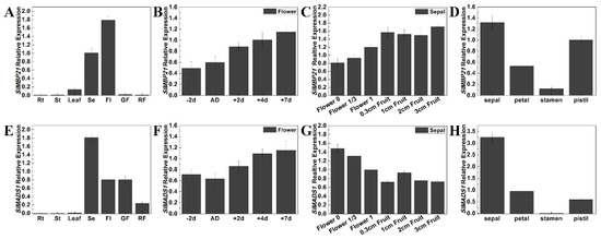 Expression analysis of SlMBP21 and SlMADS1 in different tissues of AC++ (Mill. cv. Ailsa Craig). (A) Relative expression of SlMBP21 in different tissues of AC. Rt, roots; St, stems; Leaf; Se, sepal; FL, flowers at anthesis; GF, green fruits (25 DPA); RF, red fruits (7 days fruits after breaker). (B) Relative expression of SlMBP21 in the different developmental stages of flowers. -2d, -2day-flowers before anthesis; AD, anthesis day; +2d, +2d-flowers after anthesis; +4d, +4d-flowers after anthesis; +7d, +7day-flowers after anthesis; DPA, days postanthesis. (C) Relative expression of SlMBP21 in the different developmental stages of sepals. Flower 0, sepals of -2d-flowers before anthesis; Flower 1/3, sepals of flowers at anthesis; Flower 1, sepals of 2 days after anthesis; 0.3 cm Fruit, sepals of fruit (the diameter of fruit is 0.3 cm); 1 cm Fruit, sepals of fruit (the diameter of fruit is 1 cm); 2 cm Fruit, sepals of fruit (the diameter of fruit is 2 cm); 3 cm Fruit, sepals of fruit (the diameter of fruit is 3 cm). (D) Relative expression of SlMBP21 in different floral organs of WT. (E) Relative expression of SlMADS1 in different tissues of AC. (F) Relative expression of SlMADS1 in the different developmental stages of flowers. (G) Relative expression of SlMBP21 in the different developmental stages of sepals. (H) Relative expression of SlMADS1 in different floral organs of WT. Error bars indicate SE.