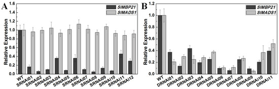 To further investigate the functions of SlMBP21 and SlMADS1 in tomato development, we constructed the single RNAi vector of SlMBP21 (SlMBP21-RNAi) (Figure S3A) and double RNAi vector of SlMBP21 and SlMADS1 (SlMBP21-SlMADS1-RNAi) (Figure S3B). These two RNAi vectors were transferred into wild-type tomato plants to obtain transgenic lines, respectively. In total, we obtained twelve single RNAi lines, in which SlMBP21 was significantly diminished from twelve independent transgenic lines, and three lines (SRNAi02, SRNAi05, and SRNAi08) which showed the lowest transcript levels of SlMBP21 were used for further investigation (Figure 3A). For the double RNAi lines (SlMBP21-SlMADS1-RNAi), we obtained eleven independent transgenic lines, and three lines (DRNAi06, DRNAi07, DRNAi09) which simultaneously showed the lowest transcript levels of SlMBP21 and SlMADS1 were used for further investigation (Figure 3B).