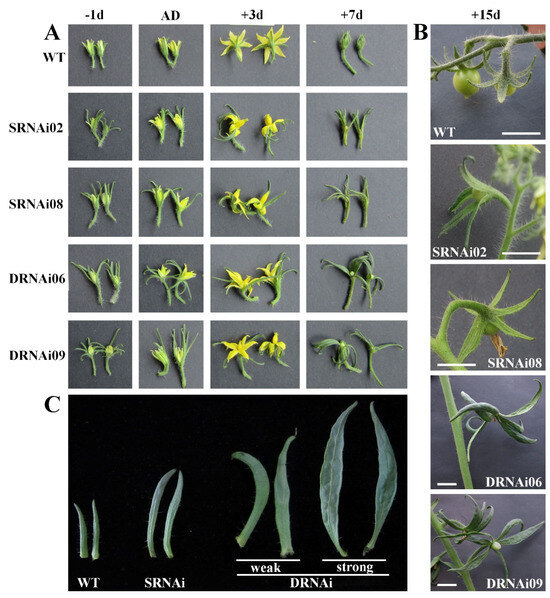 During the developmental process of tomato plants, the anthesis time was recorded. In addition to abolished development of the tomato flower abscission zone in SlMBP21-RNAi and SlMBP21-SlMADS1-RNAi lines (Figure 4A,B), we also noticed that the sepals of single SlMBP21 silencing lines grown faster than the wild type. The SlMBP21-RNAi sepals showed larger size than the wild type at the same stage (Figure 3A). Meanwhile, the SlMBP21-SlMADS1-RNAi lines showed faster sepal growth than the single SlMBP21 silencing lines and WT (Figure 3A), and as result, the sepal size of double SlMBP21-SlMADS1 silencing lines was larger than the single SlMBP21 silencing lines at the same stage (Figure 4B,C). Moreover, part of the double RNAi lines, which harbored the strongly simultaneous suppression (more than 90%) of SlMBP21 and SlMADS1, generated larger and leafy sepals than other double RNAi lines which harbored the weak suppression (70–80%) of SlMBP21, and SlMADS1 produced only enlarged but not leafy sepals (Figure 4C). The increased sepal size with the decreased expression levels of these two genes in the double RNAi lines was observed. These results indicated that the sepal size was impacted by different suppression of SlMBP21 and SlMADS1 expression levels.