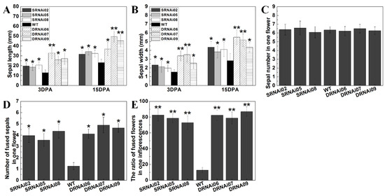 The number of fused sepals in a single flower and flowers with fused sepals of WT and transgenic lines were recorded. Sepal length and width of WT and transgenic (single and double RNAi) flowers were measured at 3 DPA and 20 DPA. In our statistics, the employed flowers were all the first and second flowers of each inflorescences. The 3 DPA flowers were used to observe the fused sepals. At least twenty flowers of each lines were contained in our statistics.