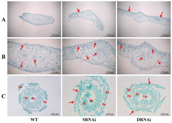 In consideration of the enlarged and fused sepals in single and double RNAi lines, the paraffin section of flowers (3 DPA) and sepals (15 DPA) was analyzed to study the differences among these three lines (WT, single RNAi lines and double RNAi lines). The results showed that the cross-section of the double silencing sepals were the widest, and the sepals of SlMBP21-RNAi lines were wider than WT (Figure 6A). In addition, we also found that the sepals of two kinds of RNAi lines generated a palisade tissue-like structure under the upper and lower epidermis, of which the phenotype was relatively more obvious in the SlMBP21-SlMADS1 silencing sepals than the SlMBP21-RNAi lines (Figure 6A,B). Moreover, based on the cross section of 3 DPA flowers, almost all of the sepals of RNAi lines linked each other with few layers of cells while the wild-type sepals were separated (Figure 6C). These results suggested that SlMBP21 and SlMADS1 are involved in the development of sepal cells.
