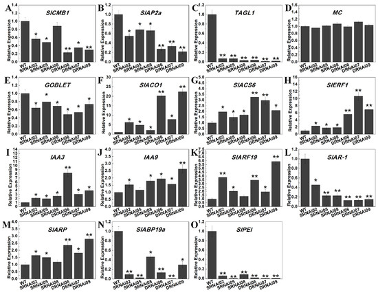 Relative expression of genes related to different biological processes during sepal development. (A–D). Relative expression levels of genes related to sepal development. (E) Relative expression level of gene related to boundary establishment. (F–H) Relative expression levels of genes related to ethylene. (I–N) Relative expression levels of genes related to auxin. (O) Relative expression level of gene related to cell expansion. The significant differences (p < 0.05, indicated by *) and highly significant differences (p < 0.01, indicated by **) were marked with the asterisks between WT and transgenic lines. Data are the means ± SE of three independent biological replicates.