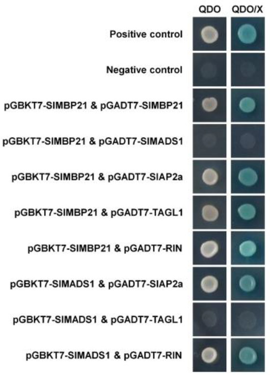 To study the interaction of SlMBP21 and SlMADS1 with other regulators in sepal development, SlAP2a, TAGL1, and the ripening-related protein RIN were selected to carry out the yeast two-hybrid assay [29,30,66,67]. The pGBKT7-SlMBP21 and pGBKT7-SlMADS1 vectors were generated to be used as the bait, respectively (Figure S4A). The pGADT7-SlMBP21, pGADT7-SlAP2a, pGADT7-TAGL1 and pGADT7-RIN vectors were obtained to be used as the prey, respectively (Figure S4B). In addition, self-activation of pGBKT7-SlMBP21 and pGBKT7-SlMADS1 was also performed and the results were negative (Figure S5). Figure 8 showed that the yeast grew on the QDO selective medium and turned blue on the QDO/X medium that contained the X-α-gal indicator, suggesting that SlMBP21 can interact with SlMBP21, SlAP2a, TAGL1, and RIN, while SlMADS1 can only interact with SlAP2a and RIN, and no interaction between SlMBP21 and SlMADS1 was observed. In addition, we performed the yeast two-hybrid assay again to verify the “positive control”, “negative control”, and the interactions of “pGBKT7-SlMBP21 & pGADT7-SlMBP21” and “pGBKT7-SlMBP21 & pGADT7-SlMADS1” (please see Figure S6).