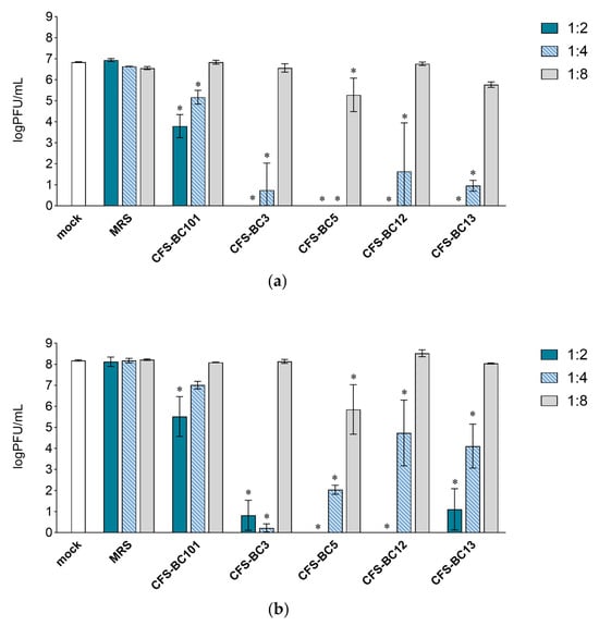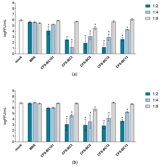 Antiviral activity of CFSs from L. crispatus BC3 and BC5, L. gasseri BC12 and BC13, E. faecalis BC101, and MRS medium on HeLa cells. HSV-1 was mock pretreated or pretreated with CFSs or MRS medium at different dilutions (1:2, 1:4, and 1:8), and virus yield was determined at (a) 24 h and (b) 48 h post-infection. Results are expressed as log PFU/mL (mean ± SD, n = 3). * p < 0.05 (vs. mock).