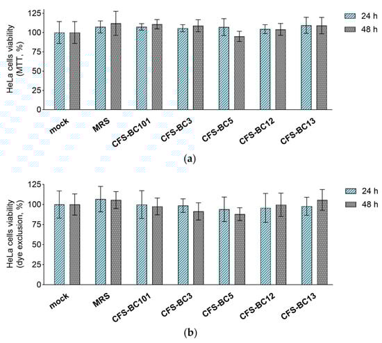 Effect of CFSs on HeLa cell viability at 24 h and 48 h after exposure. CFSs from L. crispatus BC3 and BC5, L. gasseri BC12 and BC13, E. faecalis BC101, and MRS medium were tested at the highest concentration used in the antiviral assay (corresponding to a 1:2 dilution) by means of (a) the MTT assay and (b) the erythrosine B exclusion test. Results are expressed as % of mock (100%) (mean ± SD, n = 3).