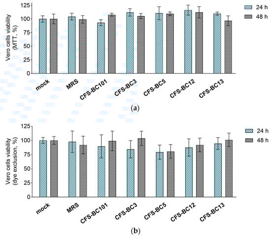 Effect of CFSs on Vero cell viability at 24 h and 48 h after exposure. CFSs from L. crispatus BC3 and BC5, L. gasseri BC12 and BC13, E. faecalis BC101, and MRS medium were tested at the highest concentration used in the antiviral assay (corresponding to a 1:2 dilution) by means of (a) the MTT assay and (b) the erythrosine B exclusion test. Results are expressed as % of mock (100%) (mean ± SD, n = 3).