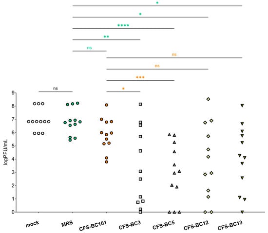 To get a global picture of the inhibitory activity of CFSs on HSV-1 described above, we sum up data obtained in Vero and Hela cells at any time and any dilution (Figure 5). Figure 5 shows a comprehensive representation and the statistical outcome following the comparison of each sample with its own corresponding sample in terms of cell line and time point. The plot shows that there is no statistically significant difference in viral yield between mock samples (untreated virus) and MRS medium-preincubated virus. In addition, CFS from the control strain, E. faecalis BC101, had an effect on virus yield that was not significantly different from MRS medium. Oppositely, CFSs recovered from vaginal lactobacilli BC3, BC5, BC12, and BC13 had an inhibitory effect on HSV-1 yield significantly different from MRS medium. In addition, this statistical analysis highlights that only the strains of the L. crispatus species (BC3 and BC5) determined an inhibition of viral yield significantly different from that exerted by E. faecalis BC101. This last comparison allows the selection of L. crispatus BC3 and BC5 as the most promising strains for the antiviral activity profile.