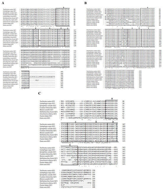 Multiple alignments of amino acid sequences of IGF1 (A), IGF2 (B), and IGF3 (C). Amino acid numbers are indicated on the right side of the sequences, all domains have been boxed and indicated as B, C, A, D, and E, and asterisk (*) indicates position that have fully conserved residues (identical AA residues between sequences), colon (:) indicates variation in AA at some sites (closely related AA), dot (.) indicates more than one variation in AA (distantly related AA). The DNAStar software used to construct multiple sequence alignment. See Table S1 for species name and NCBI GenBank accession numbers.