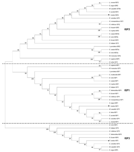 A phylogenetic tree of IGF1, IGF2, and IGF3 between golden pompano and other teleosts. The values at nodes in the system tree represent the confidence of the bootstrap test of 1000 evaluations. The evolutionary history was inferred using the neighbor-joining method. (“●”) represents Trachinotus ovatus, and bootstrap values (%) are indicated (1000 replicates). Amino acid sequence percentage similarity of the IGF family genes in golden pompano and other teleosts. MEGA11 was used to conduct the evolutionary analysis. See Table S1 for the species name and NCBI GenBank accession numbers.