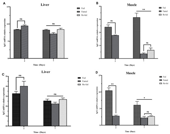 The effect of fasting on the IGF gene expression in golden pompano was investigated using quantitative real-time PCR (Figure 5). In this study, the results showed no significant difference in relative IGF1 and IGF2 mRNA expression in the liver between all groups (fed, fasted, and refed) in 2 d and 7 d, as shown (p > 0.05; Figure 5A,C). In addition, the results indicated that there was no significant difference in relative muscle IGF1 mRNA levels between the fed and fasted group in 2 d (p > 0.05; Figure 5B), but there was a significant difference between fed, fasted, and refed groups in 7 d (p < 0.05, Figure 5B). However, there was no significant difference between fasted and refed groups in 7 d. There was a significant difference in relative muscle IGF2 mRNA expression in the fed, fasted, and refed groups in 2 d and 7 d. No significant difference between fasted and refed groups in 7 d is shown in Figure 5D.