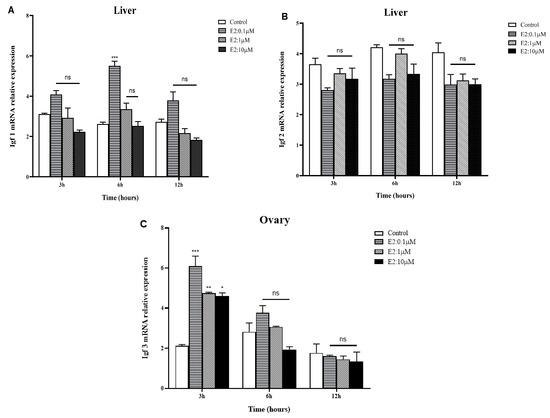 Time and dose-dependent in vitro effects of E2 on mRNA expression of IGF genes in the liver and ovary of golden pompano: (A) IGF1, (B) IGF2, and (C) IGF3. Amplification of β-actin was used as the in-house regulator. Data are presented as mean ± standard error (SEM) (n = 3), and the statistical significance (compared to the control group) was determined using two-way ANOVA, followed by Tukey’s test (p < 0.05). (*) indicates significant differences (* p < 0.01, ** p < 0.0025, *** p < 0.0005). (ns) indicates nonsignificant.