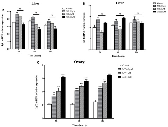 The effect of MT on mRNA expression in the liver and ovary of three IGF genes is summarized in Figure 7. The results show that there was no significant difference in the IGF1 mRNA expression level in a time- and dose-dependent manner at 3 h, 6 h, and 12 h at different concentrations (0.1, 1, and 10 μM) (see Figure 7A). The maximum IGF1 mRNA level was observed at 3 h (0.1 µM), with a minimum expression level at 6 h (10 µM). The IGF2 mRNA expression levels were observed to be similar to IGF1 mRNA expression, with slight differences. The maximum expression level was at 6 h (0.1 µM), and the minimum expression level was observed at 3 h (1 µM). At 3 h and 6 h, the IGF2 mRNA expression level trend was similar and highly expressed at 0.1 µM and 10 µM while it declined at 1 µM (see Figure 7B). On the other hand, the IGF3 mRNA level was significantly increased from lower to higher doses (0.1, 1, and 10 μM) of MT in a time-dependent manner (Figure 7C).