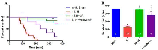 Survival in a porcine model of hemorrhagic shock and fluid resuscitation. Percent survival (A) and survival time are shown. * p < 0.05 vs. sham, † p < 0.05 vs. H, and ‡ vs. H+LR, p < 0.05 using a log-rank test (A) and one-way ANOVA followed by Bonferroni posttests (B), respectively.