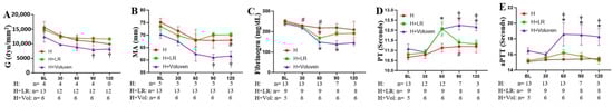 Thromboelastographic analysis determined whole blood coagulation function. Decreased levels of maximum amplitude (MA, Figure 2B) at 120 min and fibrinogen (Figure 2C) at 30 and 60 min, and prolonged PT (Figure 2D) at 90 min, were observed in the hemorrhaged animals. The H+Voluven® group drew out a reduction in the actual strength of the clot (G, Figure 2A) and the MA (Figure 2B), reaching significance in comparison with the H+LR group, indicating a relatively hypocoagulable state (p < 0.05). Hemorrhaged animals resuscitated with fluids showed significantly lower fibrinogen concentrations in blood plasma (Figure 2C) and prolonged PT (Figure 2D) and PTT compared with the H group (Figure 2E). Voluven® resuscitation resulted in a further increase in PT (Figure 2D) and aPTT (Figure 2E) and a further decrease in fibrinogen compared with the H+LR group (Figure 2C). Reaction time expressed as the ratio to the baseline value was not different when the H group was compared with fluid-resuscitated animals (p < 0.05 and p < 0.001 for H vs. H+LR, and H vs. H+Voluven®, respectively). The same was valid for K-time. There was no apparent change in the angle of the respective groups.