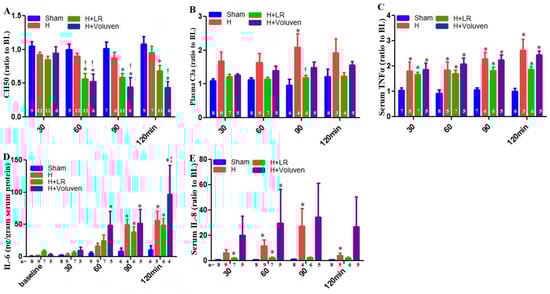 Some proinflammatory and anti-inflammatory cytokines were measured in the circulation. Normalization of tumor necrosis factor-α (TNF-α) values did not result in a significant difference between the hemorrhaged only and the H+LR group. There was no apparent difference in the TNF-α blood concentrations between the H+Fluid groups nor between the H+LR and H+Voluven® groups (Figure 3C). Systemic IL-6 levels were also increased in Voluven®-treated animals at 120 min compared with LR-treated swine (Figure 3D). As a result of the significant differences among the individual IL-8 concentrations at the baseline, plasma levels of IL-8 are shown as a percent of the baseline to permit a direct comparison of relative changes after HS. When IL-8 concentration was normalized to the baseline values, a significant difference in its levels between respective groups could not be observed (Figure 3E). Anti-inflammatory cytokines such as IL-10 were undetected in the blood.