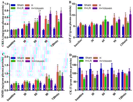 Multiple organ dysfunctions post-hemorrhagic shock and post-fluid resuscitation. Blood creatinine (A), aspartate aminotransferase (AST, (B)), muscle myocardium isoenzyme B (MMB, (C)), and creatine kinase (CK, (D)) were determined with Siemens Dimension Xpand Plus Chemistry 6 Analyzer. * vs. sham, † vs. H, ‡ vs. H+LR, p < 0.05 using two-way ANOVA followed by Bonferroni posttests. Data are presented as mean ± SEM.