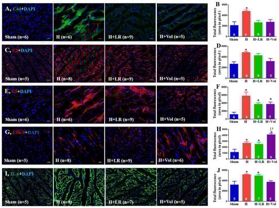 Myocardial inflammatory responses after hemorrhagic shock and fluid resuscitation. Immunostaining and semiquantitative fluorescent intensity of C4d (A,B), C3 (C,D), C5 (E,F), C5b-9 (G,H), and IL-6 (I,J) in heart tissues were evaluated by immunohistochemistry. Scale bars = 50 μm. * vs. sham, † vs. H, and ‡ vs. H+LR, p < 0.05 using one-way ANOVA followed by Bonferroni posttests. Data are presented as mean ± SEM. Vol, Voluven. DAPI = 4′, 6′-diamidino-2-phenylindole.