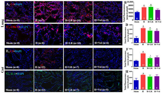 Pulmonary/intestinal inflammatory responses after hemorrhagic shock and fluid resuscitation. Immunostaining and semiquantitative fluorescent intensities of C3 (A,B) and C5b-9 (C,D) in lungs and C3 (E,F) and IL-6 (G,H) in jejunum were evaluated by immunohistochemistry. Scale bars = 50 μm. * vs. sham, † vs. H, p < 0.05 using one-way ANOVA followed by Bonferroni posttests. Data are presented as mean ± SEM.