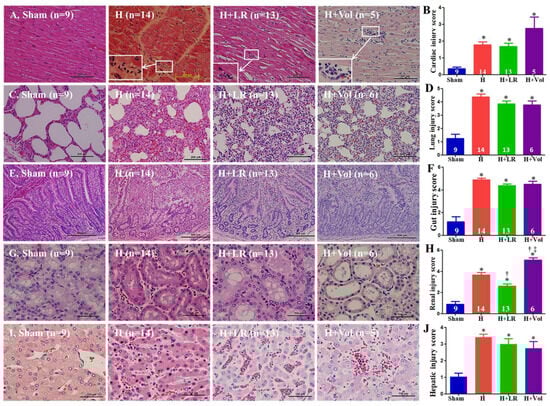 Histopathological changes in end organs after hemorrhagic shock and fluid resuscitation. Histopathological (H&E stain) photos and semiquantitative evaluations of the heart ((A,B), magnification = ×200, scale bars = 200 µm), lung ((C,D), magnification = ×200, scale bars = 200 µm), jejunum ((E,F), magnification = ×100, scale bars = 500 µm), kidney ((G,H), magnification = ×400, scale bars = 100 µm), and liver ((I,J), magnification = ×400, scale bars = 100 µm). Myocarditis is marked with white arrows (A), and the insert in panel (A) magnifies the region of the indicated box to show the mononuclear cells and polymorphic nuclear cells in the corresponding inflammatory infiltration foci. Data are presented as mean ± SEM. * vs. sham, † vs. H, and ‡ vs. H+LR, p < 0.05, using one-way ANOVA followed by Bonferroni posttests.