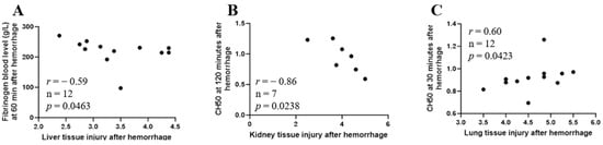 There was an inverse correlation between blood levels of fibrinogen at 60 min after hemorrhage and liver tissue injury score (Figure 8A, Spearman r = −0.59, n = 12, p = 0.0463) and CH50 at 120 min after hemorrhage and kidney tissue injury score (Figure 8B, Spearman r = −0.86, n = 7, p = 0.0238), and a positive correlation between CH50 at 30 min after hemorrhage and lung tissue injury score (Figure 8C, Spearman r = 0.60, n = 12, p = 0.0423).