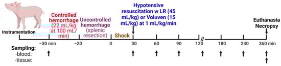 Fluid resuscitation was performed 30 min after the splenic injury was completed, marked as a zero-time point (Figure 8). Resuscitation started with intravenous infusion with crystalloid (lactated Ringer’s solution; LR) at 45 mL/kg body weight or colloid solution (Voluven®, 6% hydroxyethyl starch 130/0.4 in 0.9% sodium chloride injection; Fresenius Kabi Norge AS, Halden, Norway) at 15 mL/kg body weight at a rate of 1 mL/kg/min using our servo-controlled computerized pump. Animals were observed for 6 h after the injury or until death.