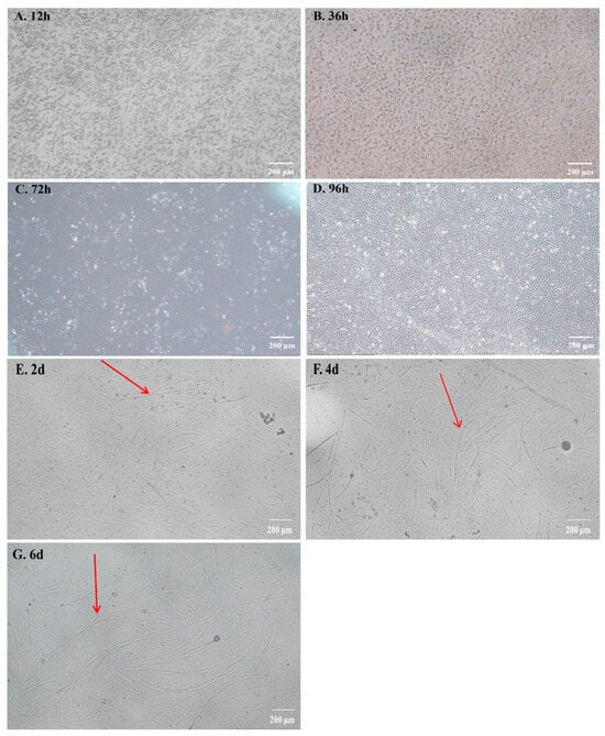 Following the method described by Zhen and Zhu for isolating and culturing muscle cells [27,28], we discovered that the majority of cells were digested by collagenase, adhered to the 25 cm2 cell culture bottle, and exhibited a pebble-like morphology within 12–36 h (Figure 1A,B). After a duration of 72 h, the cells underwent deformation, resulting in an elongated fused morphology, and displayed an increased rate of proliferation (Figure 1C). By 96 h, the cell density reached between 60% and 80%, with distinct alignment (Figure 1D). During induction differentiation, myoblasts progressively fused and differentiated into myotubes (Figure 1E–G).