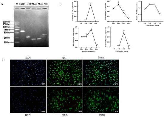 The regulatory factors Pax7, MHC, MYOD, and MYOC play crucial roles in myogenesis by influencing the fate determination of myoblast precursor cells and promoting myoblast proliferation. The RT-PCR results depicted the expression of marker genes Pax7, MHC, MYOD, and MYOC in isolated and purified bovine myoblasts (Figure 2A). Furthermore, distinct temporal intervals during cell proliferation revealed the mRNA expression of proliferation maker genes Pax7, CDK2, PCNA, and CyclinD1. The QRT-PCR results demonstrated that key genes associated with myogenesis exhibited an initial increase followed by a subsequent decline. The expression levels of CDK2 and CyclinD1 reached their peak at 36 h, while Pax7 and PCNA peaked at 24 h. In the late proliferation, there was a significant decrease in the expression of these four maker genes (Figure 2B). Subsequently, immunofluorescence analysis was performed to identify the isolated cells based on the specific expression proteins Pax7 and MYH7. The results demonstrated the positive expression of Pax7 and MYH7 proteins in nearly all cells (Figure 2C). These findings collectively indicate that the isolated cells are highly pure myoblasts.