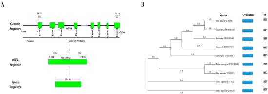 Sequence analysis and inferred phylogenetic tree of the NCAPG gene. (A) The detailed genomic, mRNA, and protein components containing the 5′/3′-untranslated region (5′/3′-UTR), and the CDS of bovine NCAPG. The figure omits the sequence from exon 5 to exon 18, as indicated by the dotted lines. (B) Phylogenetic tree of amino acids in the NCAPG protein of nine species, including Bos taurus. The left image shows the clustering of the NCAPG protein in different species, and the right shows the architecture and characteristics of the NCAPG protein amino acid length in corresponding species.