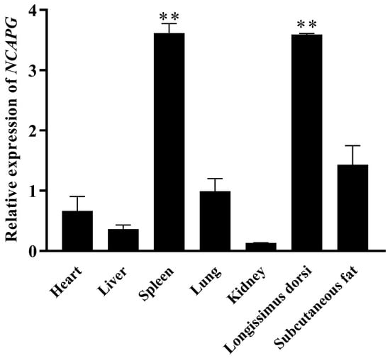 Gene expression of NCAPG in different tissues. The relative expression pattern of the NCAPG gene was detected using quantitative real-time PCR in a range of bovine tissues, and the lung was set as unit 1 to compare different tissues. The results are represented as the mean ± the SD based on three independent experiments. ** indicates significance at p < 0.01 compared to the control group. Error bars represent the SD.