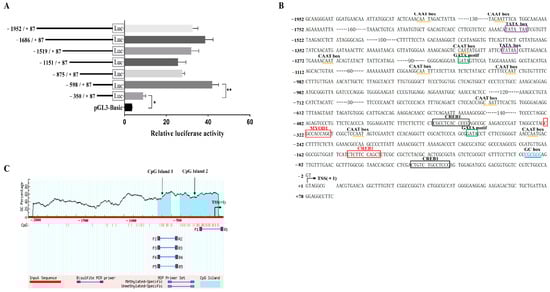 Construction of fragment deletion of the NCAPG gene promoter and the isolation and sequence analysis of the functional proximal minimal promoter of NCAPG. (A) Relative luciferase activity of different promoter fragments. These plasmids were transfected into C2C12. The results are expressed as the mean ± the SD in arbitrary units based on the firefly luciferase activity normalized against the Renilla luciferase activity for triplicate transfections. (B) The sequence of the 5′ regulatory region of bovine NCAPG. Arrows indicate the transcription initiation sites. The TF binding sites and regulatory elements are shown in boxes. (C) Schematic representation of the proximal promoter region (+87 to −1952 base pairs) of the bovine NCAPG gene to predict the regions with high GC content. Dashed lines indicate the GC percentage as represented by the y-axis, and the x-axis denotes the bp position in the 5′ untranslated region; vertical lines indicate the relative positions of CpG islands. Coordinates are given relative to the translational start site (shown as +1) * indicates significance at p < 0.05, and ** indicates significance at p < 0.01 compared to the control group. Error bars represent the SD.