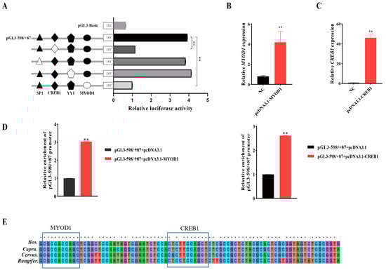 To further validate the involvement of CREB1 and MYOD1 in the regulation of bovine NCAPG promoter activity, a co-transfection approach was employed to introduce an overexpression vector containing both CREB1 and MYOD1 into bovine myoblasts, along with pGL−598/+87. Initially, we assessed the transfection efficiency by examining the overexpression levels of CREB1 and MYOD1 in bovine myoblasts (Figure 6B,C). The results demonstrated a significant upregulation of these transcription factors. Subsequently, our findings also revealed that the overexpression of CREB1 and MYOD1 substantially augmented the activity of the NCAPG core promoter (Figure 6D).