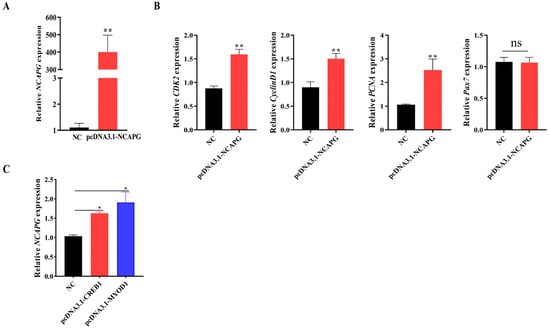 In order to investigate the genetic and molecular regulatory mechanisms of NCAPG in the process of myogenesis in myoblasts, the mRNA expression levels of pertinent marker genes associated with myogenesis and bovine myoblast development were examined. NCAPG overexpression (pcDNA3.1-NCAPG) led to a significant increase in the NCAPG mRNA expression level (Figure 8A). The overexpression of NCAPG in bovine myoblasts has been shown to be effective and successful. Furthermore, pcDNA3.1-NCAPG myoblasts exhibited higher mRNA expression levels of CDK2, CyclinD1, and PCNA compared to the pcDNA3.1(+) empty vector (NC) (Figure 8B). However, no significant alteration was observed in Pax7 gene expression (Figure 8B). The expression level of NCAPG increased significantly with the overexpression of CREB1 and MYOD1 (Figure 8C). These findings indicated that NCAPG overexpression can activate myogenesis genes in myoblasts.