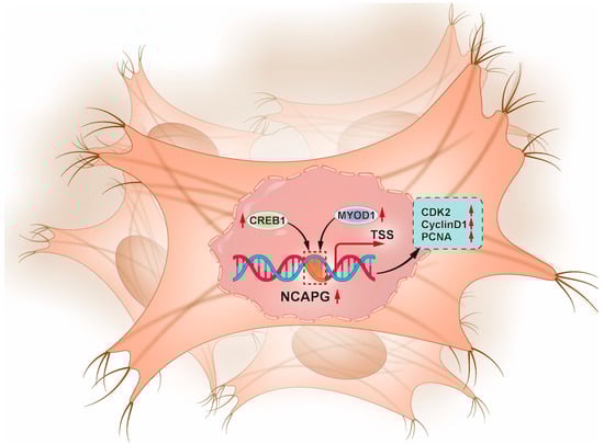 In summary, the existing literature has consistently highlighted the regulatory roles played by MYOD1 and CREB1 transcription factors in these crucial processes, particularly myogenesis. Thus, this study suggests that the NCAPG gene, whose key transcriptional regulatory elements are MYOD1 and CREB1, critically regulates bovine myogenesis. In this study, there are some limitations. We have focused on screening and identifying important transcription factors potentially involved in the regulation of bovine NCAPG gene transcription. However, the detailed regulatory mechanisms by which these key transcription factors influence NCAPG gene activity remain inadequately understood. Therefore, we plan to perform functional verification at the cellular level in vitro in the future. This approach aimed to enhance our understanding of the molecular regulatory mechanism of NCAPG gene in bovine muscle development. A proposed model of the transcriptional regulatory system of the bovine NCAPG gene is provided in Figure 9.