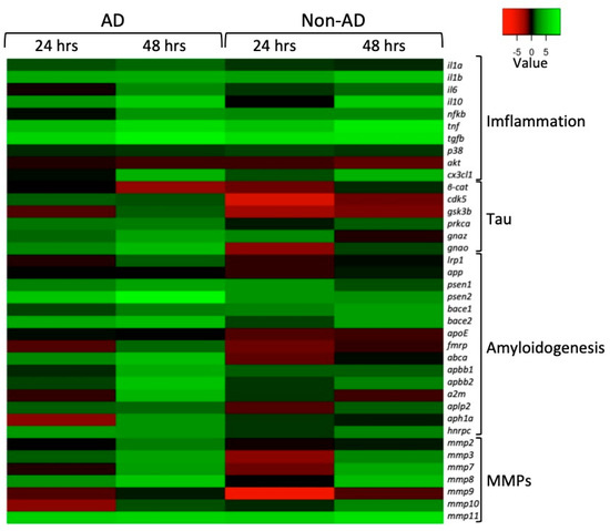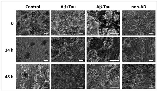 2.4. Quantitative PCR Performed on NAM Co-Cultures Treated with CSF from AD (Aβ+Tau and Aβ-Tau) and Non-AD (Non-AD) Subjects at 24 h and 48 h, Respectively