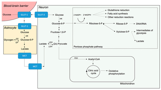 Once inside the cell, glucose is converted to glucose-6-phosphate by hexokinase, trapping it inside the cell. In aerobic conditions, glucose-6-phosphate undergoes subsequent conversion to pyruvate, which in turn undergoes oxidative decarboxylation to acetyl-CoA. Acetyl-CoA enters the citric acid cycle and through oxidative phosphorylation generates adenosine triphosphate (ATP). There are three other important pathways of glucose metabolism, which are summarised in Figure 1. First, the pentose-phosphate pathway, which is activated from glucose-6-phosphate primarily in response to the cellular demands for nucleic acid synthesis and the generation of NADPH, which is an important electron donor that ensures the preservation of antioxidants in their functional reduced state. Second, the production of glycogen from glucose-6-phosphate, which in the brain is solely produced in astrocytes [8]. Glycogen functions as an energy reserve, but concentrations are much lower in the brain compared to the liver or muscle, and can provide energy for only a few minutes [19,20]. Last, the conversion of pyruvate into lactate. Once thought to be toxic and solely produced under anaerobic conditions, the role of lactate in cerebral metabolism is thought to be more nuanced [8]. The astrocyte-neuron lactate shuttle (ANLS) is a widely discussed concept, where astrocytes take up glucose, convert it to lactate, and transport it to neurons by monocarboxylate transporters for use lactate in aerobic metabolism [8,9,21]. During activity, the neurotransmitter glutamate triggers increased uptake of glucose by astrocytes [21]. Studies indicate that neurons preferentially take up lactate over glucose as an oxidative substrate when both are available [21].
