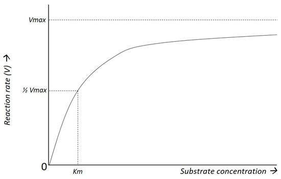 Michaelis–Menten kinetics. As substrate concentration rises the reaction rate increases until it approaches the maximum reaction rate (Vmax). The Michaelis–Menten constant (Km) is defined as the substrate concentration at which the reaction rate is half of Vmax.