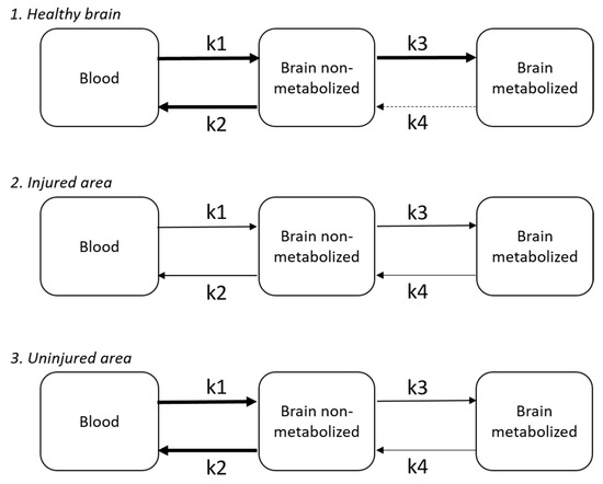 Applying this to the brain, the model incorporates different compartments and relies on reversible Michaelis–Menten kinetics to facilitate transport between compartments (Figure 3). This allows a linear relationship between plasma and cerebral glucose [69]. In this model, k1 represents the rate constant of transport into the brain, while k3 represents hexokinase activity [68].
