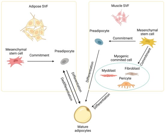 - Lau, A.M.; Tseng, Y.H.; Schulz, T.J. Adipogenic fate commitment of muscle-derived progenitor cells: Isolation, culture, and dif-ferentiation. Methods Mol. Biol. 2014, 1213, 229–243. [Google Scholar] [PubMed]