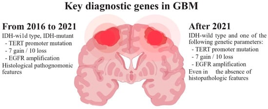 - Louis, D.N.; Perry, A.; Wesseling, P.; Brat, D.J.; Cree, I.A.; Figarella-Branger, D.; Hawkins, C.; Ng, H.K.; Pfister, S.M.; Reifenberger, G.; et al. The 2021 WHO Classification of Tumors of the Central Nervous System: A Summary. Neuro-Oncology 2021, 23, 1231–1251. [Google Scholar] [CrossRef] [PubMed]