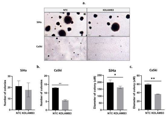 2.6. LAMB3 siRNA Knockdown Reduced the Anchorage-Independent Growth of HPV16-Positive Cervical Cancer Cell Lines