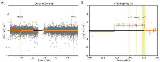 Plot bin-level coverages and segmentation calls together. (A) Example of deletions on chromosome 19 affecting the MUC16 and PPP6R1 genes. (B) Example of duplications on chromosome 14 affecting the TTC5, PARP2, and TEP1 genes.