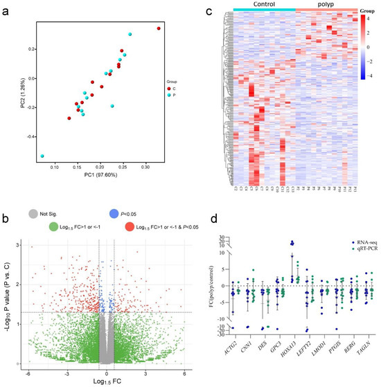 Differences in gene expression between polyps and adjacent endometrial tissues. (a) PCA analysis shows gene expression differences between polyp and control groups: red dots represent adjacent endometrial tissues (control, C) and blue dots represent polyp tissues (P). To increase the clarity of the figure, we redrew it based on the original figure. Please see Figure S1 in the Supplementary Materials for the original figure. (b) Volcano plot revealing transcriptional changes (fold change, FC = polyp/control) in polyp tissues and control groups. DEGs were defined as log1.5 FC > 1 or < −1 with a p-value < 0.05. (c) Unsupervised hierarchical clustering heatmap of 322 DEGs. The color depth of red blocks represents the overexpression level of genes. The color depth of blue blocks represents the downregulation level of genes. (d) Expression differences (fold changes) of 10 selected genes between polyps and adjacent endometrial tissues were analyzed by qRT-PCR (green dots) and compared with RNA-seq results (blue dots) (n = 12).