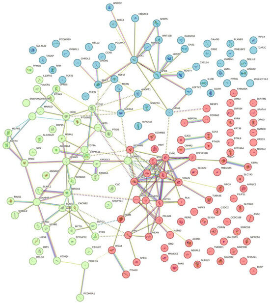 The human PPI network in the STRING database was used to examine the interactions between DEG-encoded proteins. STRING analysis of all DEGs revealed that the PPI network contained 172 protein nodes and 160 edges (Figure 2). DEGs that do not appear in the nodes can be predicted genes, long non-coding RNAs that do not encode proteins, or genes not included in the STRING database. On the STRING platform, we utilized the k-means clustering algorithm to divide the 172 protein nodes into three clusters, each represented by a distinct color (red, green, blue), with 48, 73, and 51 nodes, and 28, 57, and 52 edges, respectively.