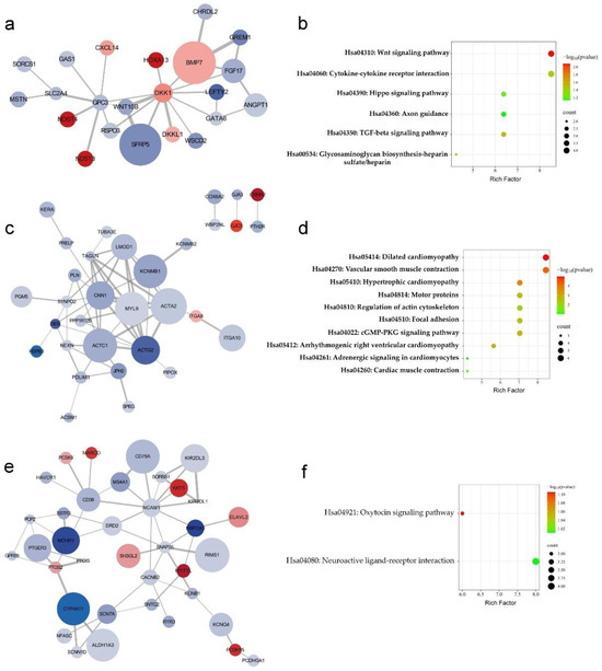 KEGG results show that essential pathways in each subcluster are the Wnt signaling pathway, cytokine–cytokine receptor interaction, hippo signaling pathway, axon guidance, TGF-beta signaling pathway, and glycosaminoglycan biosynthesis–heparan sulfate/heparin (Figure 3b); dilated cardiomyopathy, vascular smooth muscle contraction, hypertrophic cardiomyopathy, motor proteins, regulation of actin cytoskeleton, focal adhesion, cGMP-PKG signaling pathway, arrhythmogenic right ventricular cardiomyopathy, adrenergic signaling in cardiomyocytes, and cardiac muscle contraction (Figure 3d); and oxytocin signaling pathway and neuroactive ligand receptor interaction (Figure 3f). Among them, the Wnt signaling and dilated cardiomyopathy signaling pathways were the most significant.