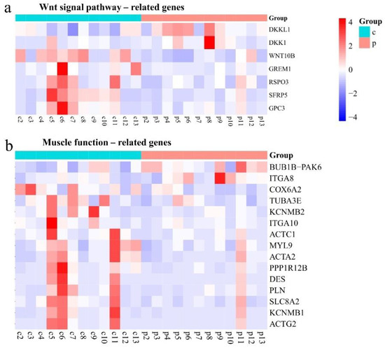 Unsupervised hierarchical clustering heatmap of Wnt signaling pathway (a) and muscle function-related genes (b).